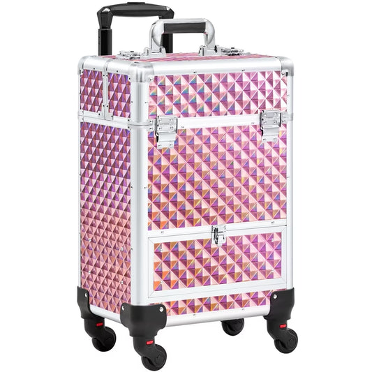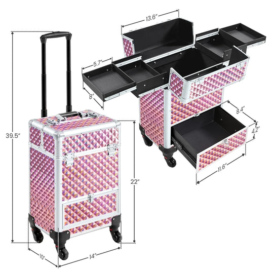 Aluminum Cosmetic Makeup Train Case with 4 Side Trays & 1 Slide-Out Drawer, Glitter Pink