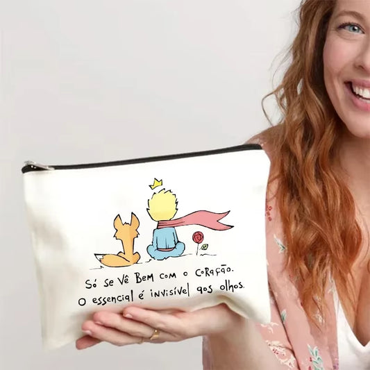 Cartoon Little Prince and Fox Makeup Bag Eco Canvas Women Travel Cosmetic Organizer Toilet Pouch Side Bag for Ladies Cute Purse